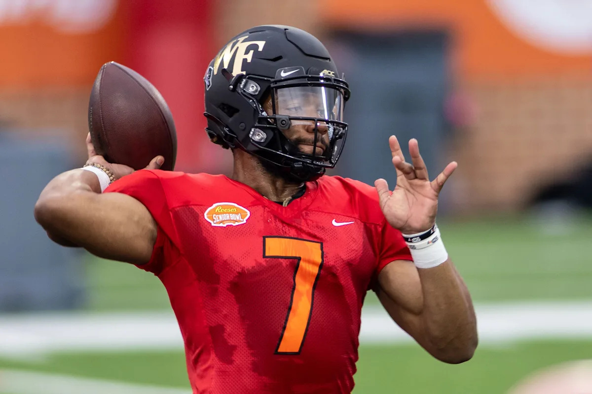 American quarterback Jamie Newman of Wake Forest/Georgia (7) throws in drills during National team practice