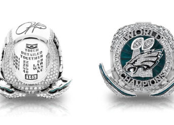 Inscribed on the inside of the rings are the words “TOUGH,” “DETAILED” and “TOGETHER,” as well as the scores of each game from the Eagles’ playoff run. Following a 14-3 regular season and NFC East title, Philadelphia made its way to the Super Bowl with a 22-10 win over the Green Bay Packers in the wild-card round, a 28-22 victory against the Los Angeles Rams in the divisional round and a 55-23 shellacking of a familiar foe in the Washington Commanders during the NFC championship.