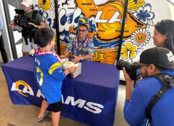 The next morning, flag football players excitedly buzzed “It’s Puka!” as he entered War Memorial Stadium for a Rams workout and clinic. That afternoon, autograph seekers lined up 100-deep for an exclusive afternoon Puka-centric event at a team pop-up store.